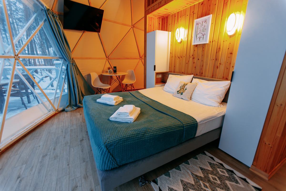 - Размещение в уютных номерах с террасой или в стильных коттеджах с панорамными окнами и видом на озеро или сосновый бор.