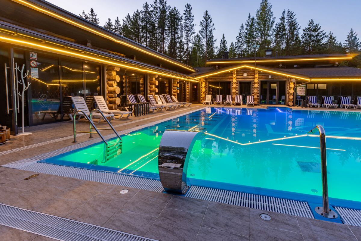 - Акватермальный комплекс с круглогодичным бассейном под открытым небом: зимой температура воды поддерживается на уровне +42 °C, летом – около +28 °C. Дополняют атмосферу гидромассажи, гейзеры и противотоки.