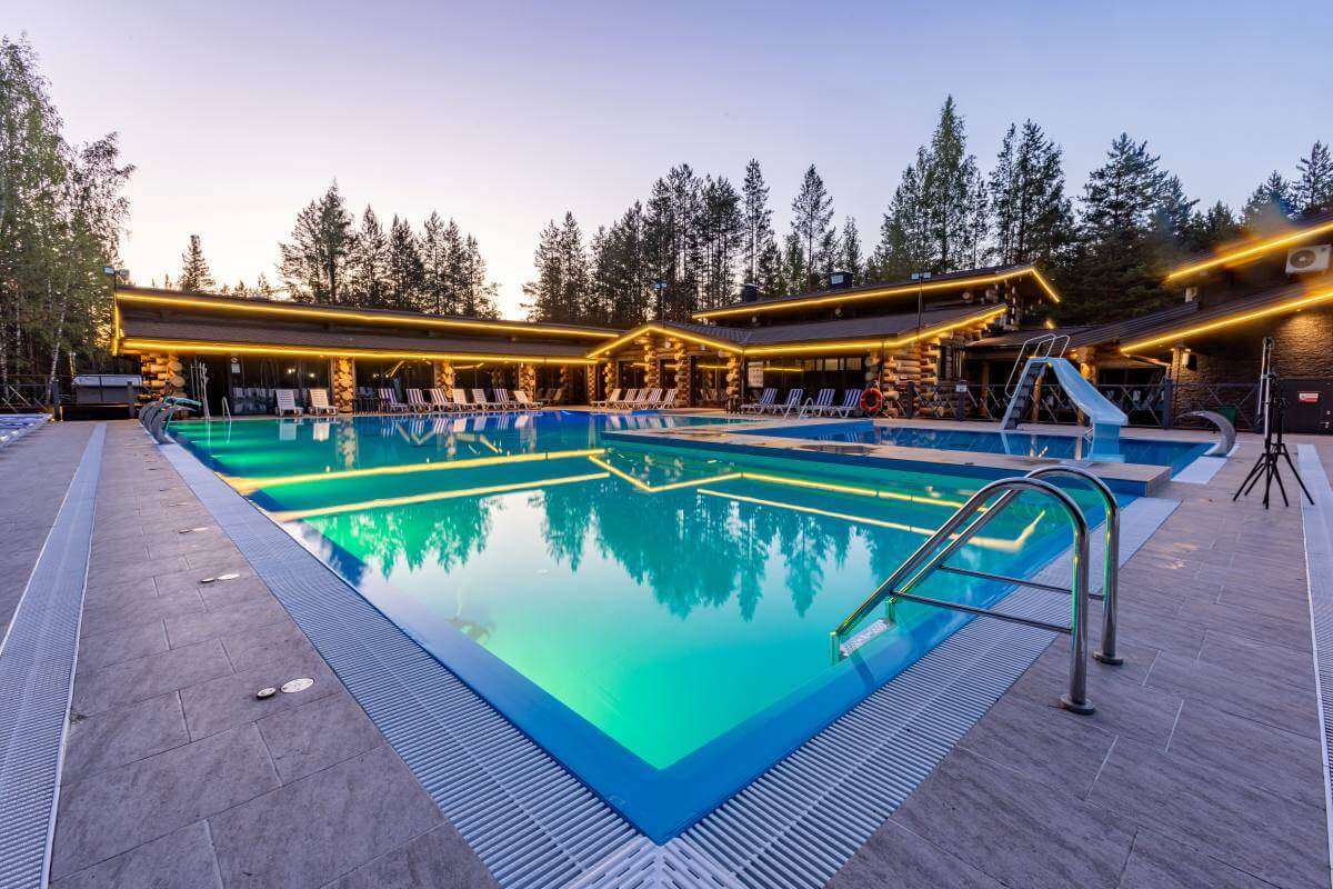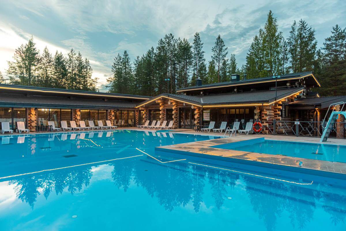 Центр притяжения локации – большой открытый бассейн площадью более 300 м², окруженный хвойным лесом. Зимой температура воды поддерживается на уровне +42 °C, а летом – +28 °C. Даже в мороз здесь можно с комфортом купаться, наслаждаясь видом заснеженных сосен и чистым карельским воздухом.