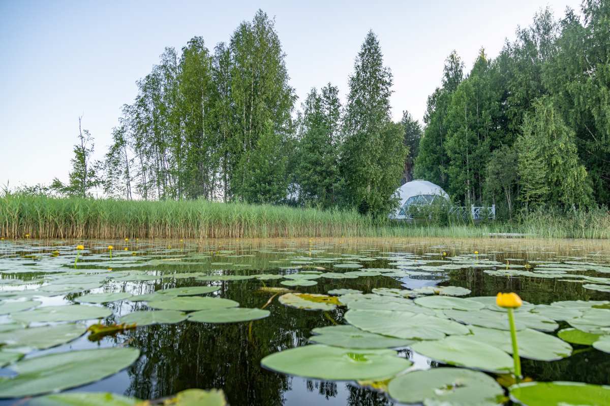 Место находится на территории парк-отеля «Хвоя Карелия». Здесь можно остановиться в уютных номерах с террасой, купольных домах или современных шале с панорамными окнами. Из каждого открывается вид на озеро или густой лес.
